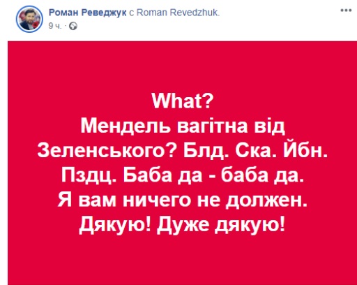 Так, 8-го липня засновник політичного руху на підтримку Порошенка "25%" Роман Реведжук виклав на своїй Facebook-сторінці провокаційний пост, в якому висловлює припущення про вагітність Мендель від президента.